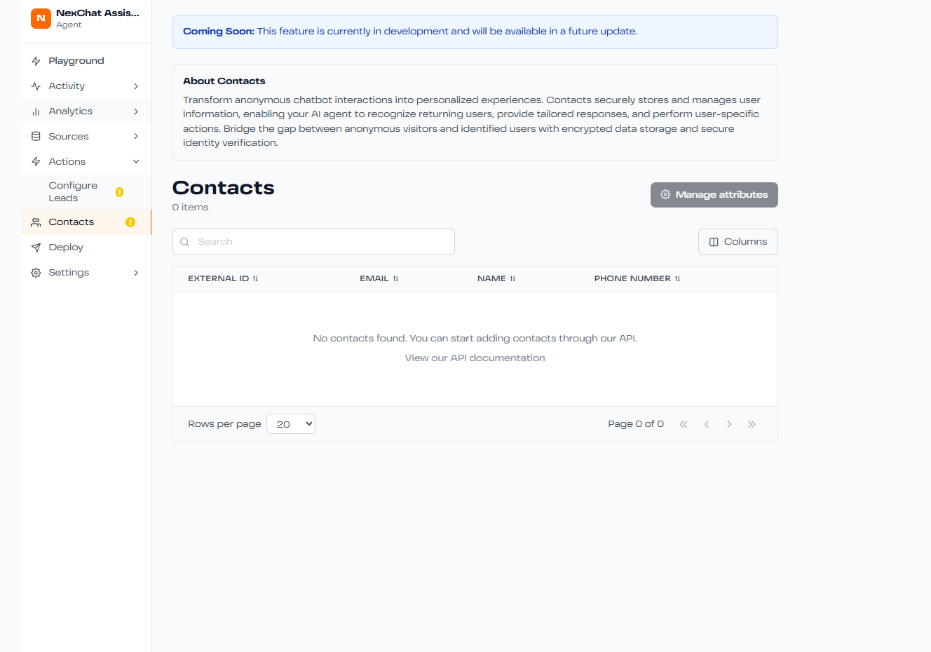 Contacts are individuals who have interacted with your AI agent and provided their information. The Contacts section helps you: