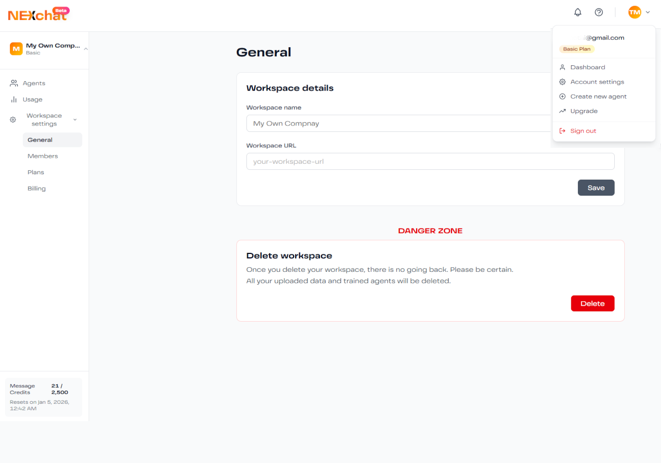 Customize your workspace URL slug (e.g., nexchat.co/workspace/your-company)